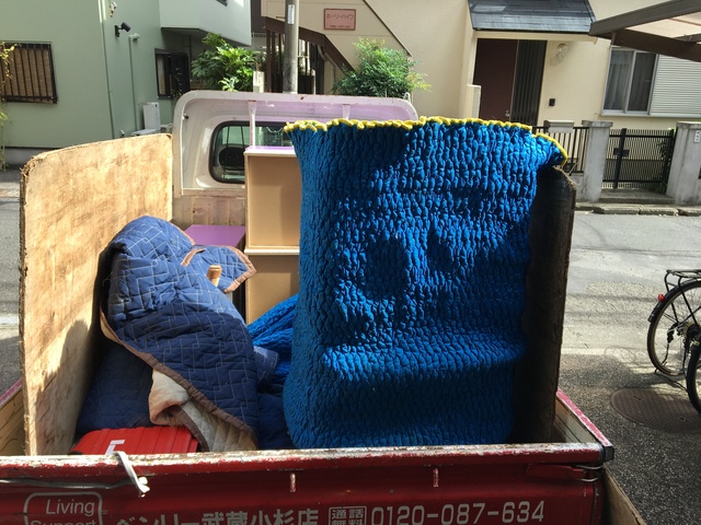 軽トラックの荷台まで、台車を使って慎重に運ぶ。エレベーターがある場合は、台車に乗せて運ぶことで床や壁への負担を軽減できる。